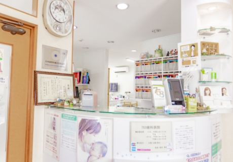 こちらが「753歯科医院」の受付です。いつでもスタッフが笑顔でお迎えします。初診の際やその月の初めての受診の際には保険証のご提示をお願いします。受付やお会計、次回のご予約などの受付業務だけでなく、気になること、疑問に思うこと、困ったことなどがございましたら、何でもお気軽にお声がけください。