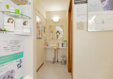 当院では明るく清潔感のある歯みがきスペースをご用意していますので、食事やおやつのあとでも安心してご来院ください。治療前の歯みがきや、お口まわりのお化粧を落としにご利用いただけます。また、治療後はお化粧直しなど身だしなみを整える際にもご自由にご利用ください。