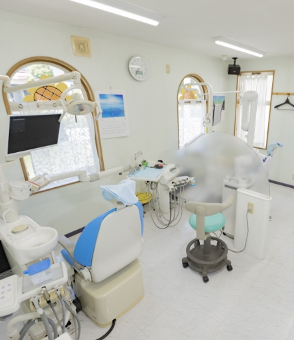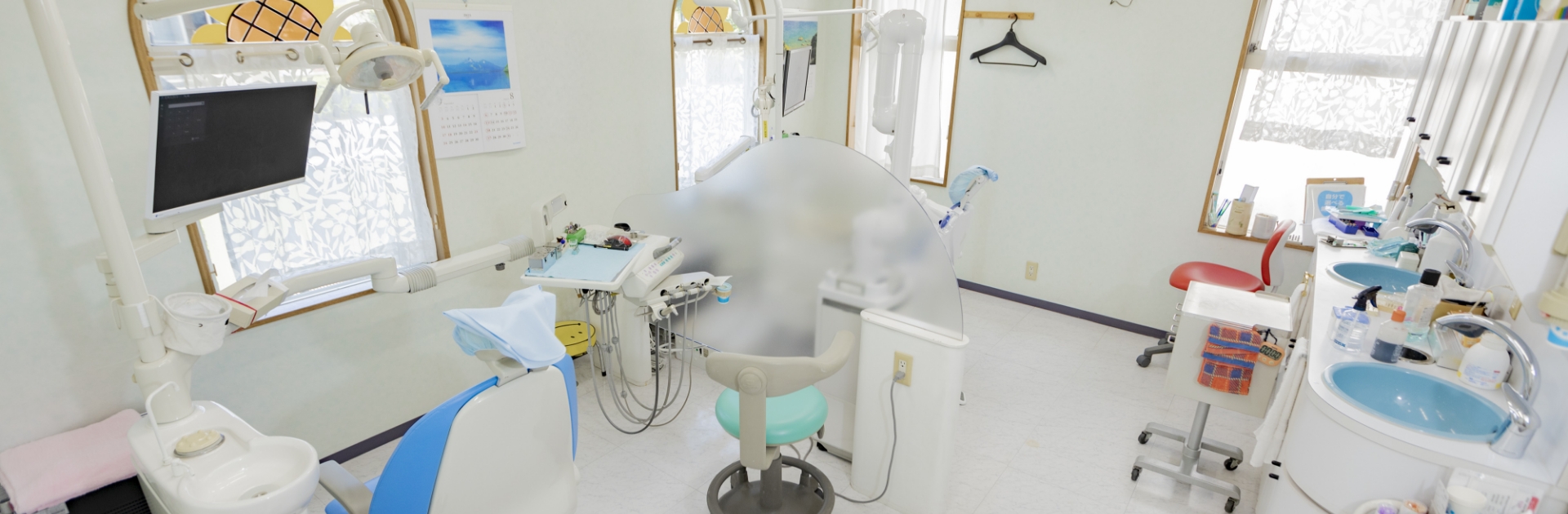 こちらが診療ユニットです。診療室内や診療ユニットは常に清潔を保ち院内感染予防のため衛生管理を徹底しています。できるだけ痛みを抑えた治療をするのが当院のモットーです。患者さまが何をされるのか不安な気持ちにならないように一つひとつの処置の前にお声がけをしていますので、リラックスして診療をお受けください。