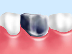 保険診療のむし歯治療ではレジン(歯科用プラスチック)や金銀パラジウム合金が使われます。レジンは、白っぽい色なのであまり目立ちませんが、経年により着色していきます。金銀パラジウム合金とはいわゆる「銀歯」で白い歯列の中で黒く見えて目立ちます。銀歯のデメリットは目立つだけではありません。経年により少しずつ金属がイオン化して溶け出し、体内に吸収されると全身に金属アレルギーの症状が現れることがあります。また歯ぐきの黒ずみの原因にもなるのです。