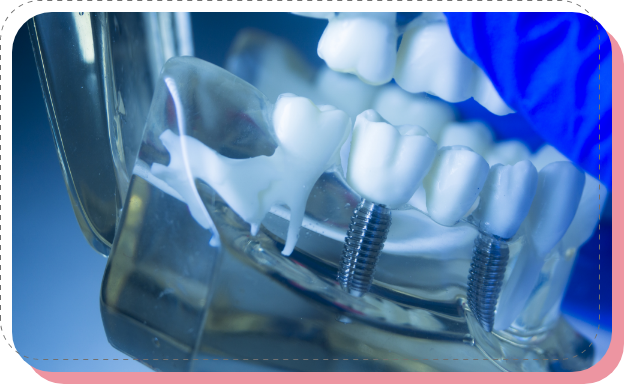 歯を失った部分の顎の骨にインプラントを埋め込み、その上に人工歯、または特殊な入れ歯を装着します。外科手術が必要です。