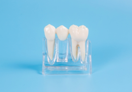 となりの歯を削って支台にして橋のように連結した人工歯を取りつけます。支台にした歯に大きな負担がかかり、歯の寿命を縮めてしまいがちです。