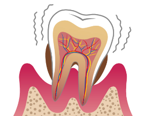 さらに歯周ポケットが深くなります。歯ぐきの腫れや出血のほか、歯がグラつきはじめ、歯が浮く感じや口臭が現れます。