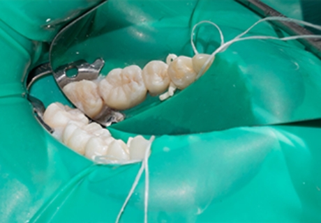 ラバーダムとは、歯に装着するゴム状のコートで、根管内に細菌が入り込むリスクを抑えるために使用しています。